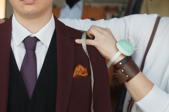 お客様一人ひとりの体型に合わせて、プロのスタッフが正確に採寸を行います。肩幅、袖丈、ウエストなどの細かい部分まで測定し、身体にぴったりと合うスーツを作成します。採寸時は姿勢や動き方も考慮されます。