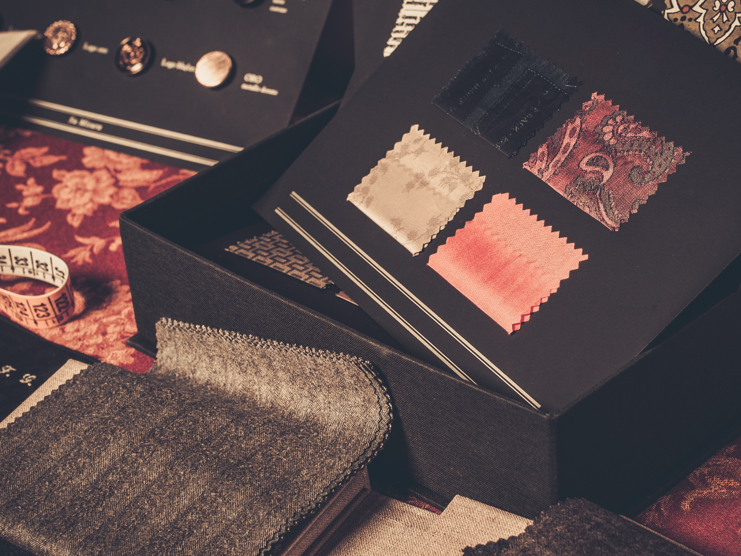 ヒヤリングをもとに、豊富な生地見本からお好みや用途に合った生地を選びます。高級ウールや混紡素材など、さまざまな選択肢があります。色や柄についても、スタッフからアドバイスを受けることができます。